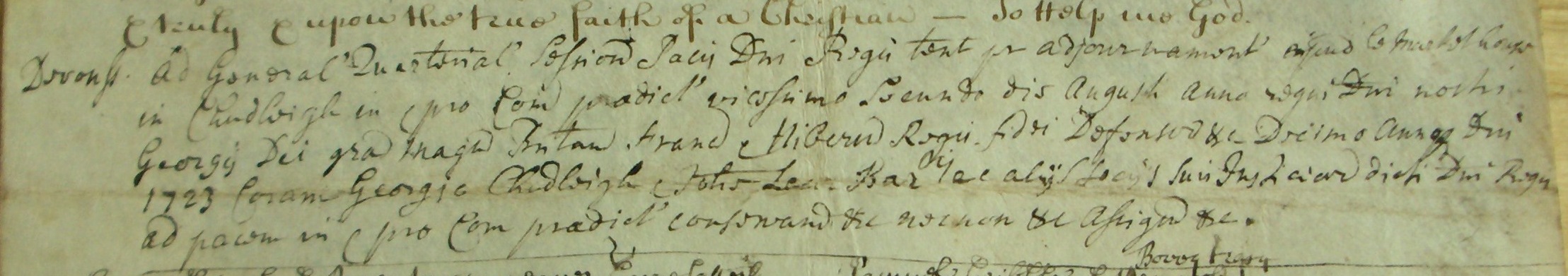 Devonss. Ad General[em] Quarterial[em] session[em] Pacis D[omi]ni Regis tent[am] p[e]r adjournament[um] apud le market house in Chudleigh in & pro Com[itatu] praedict[o] vicesimo secundo die Augsti anno regni D[omi]ni nostri Georgii Dei gra[tia] magn[e] Britann[iae] Franc[iae] & Hibern[iae] Regis fidei Defensor[is] &c Decimo Anno[que] D[omi]ni 1723 Coram Georgio Chudleigh & Johe[nne] Lear Bar[onettis] ac aliis sociis suis Justiciar[is] dicti D[omi]ni Regis ad pacem in et pro Com[itatu] pradict[o] conservand[am] &c necnon &c assign[atis] &c.