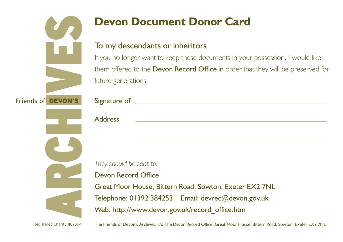 The DEVON DOCUMENT DONOR CARD is the first initiative of its kind in Britain aimed at stopping the loss of our historic written heritage. The intention is to end the needless destruction of valuable documents during house clearances when heirs and executors often do not have sufficient time to read through the great accumulation of papers. Important papers are often unknowingly destroyed and this card aims to pre-empt that process. Copies of the cards are available from the record offices and we hope to have the cards in local libraries shortly.