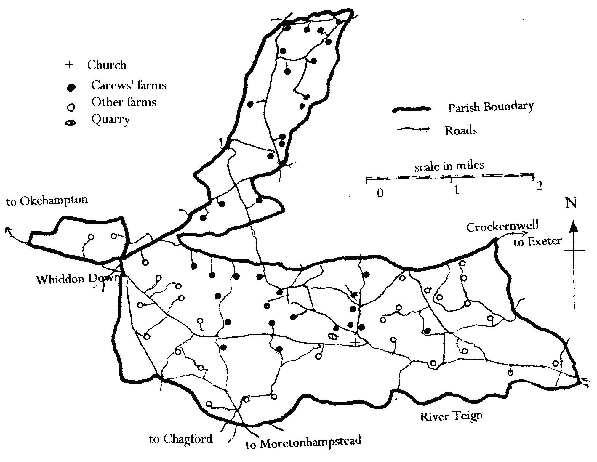A limestone ridge running east/west through the centre of the parish had been quarried for at least three centuries and in some places minerals such as tin and copper had been mined. The village which had grown up around the church, marked + on the map, is still the principal settlement and there was a hamlet at Crockernwell. The map shows isolated farms in the rest of the parish.